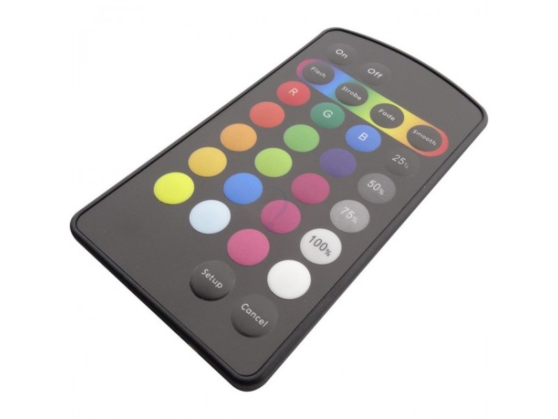 Telecomanda acestui controller are 28 de taste cu urmatoarele functii: pornit, oprit, setarea unei culori, setarea unui program sau joc de lumini si cresterea sau scaderea intensitatii luminoase cu praguri specifice.