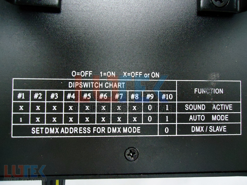 - Play Mode: sunet activ, AUTO, DMX512 (7 canale), Master / Slave