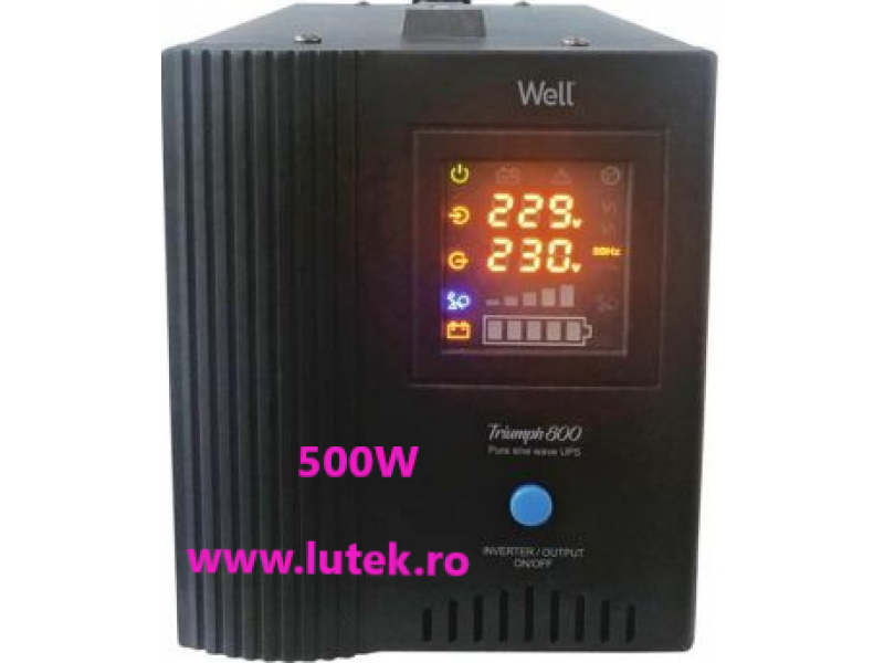 UPS centrale termice Well Triumph 230V 800VA 500W,reprezinta solutia ideala pentru a va proteja centrala termica pe lemne, echipamentele cu motoare si alte electronice sensibile la intreruperile de curent. Aceasta protejeaza in cazul supratensiunilor pe reteaua elecrtica (la priza), a tensiunilor de alimentare sub valoarea normala sau a scurtcircuitelor. Tensiunea furnizata de acest UPS este cu forma de unda sinus-PUR, sinusoida fiind ca cea de la priza.Durata de furnizare a tensiunii din resurse propria,este proportionala cu (marimea) capacitatea acumulatorului folosit, 60Ah pina la 150Ah, respectiv (24..48 ore). Tensiunea de intrare poate varia intre 150 si 270Vac, iar tensiunea de iesire este de 230VAC (+/-3% RMS). Caracteristici: