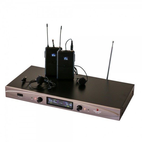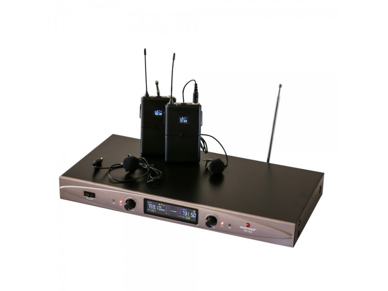 Kit microfoane cu lavalieră ce conține 2 microfoane cu lavalieră wireless și un receiver.