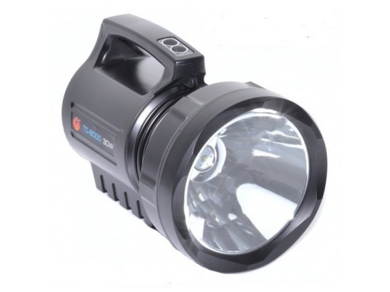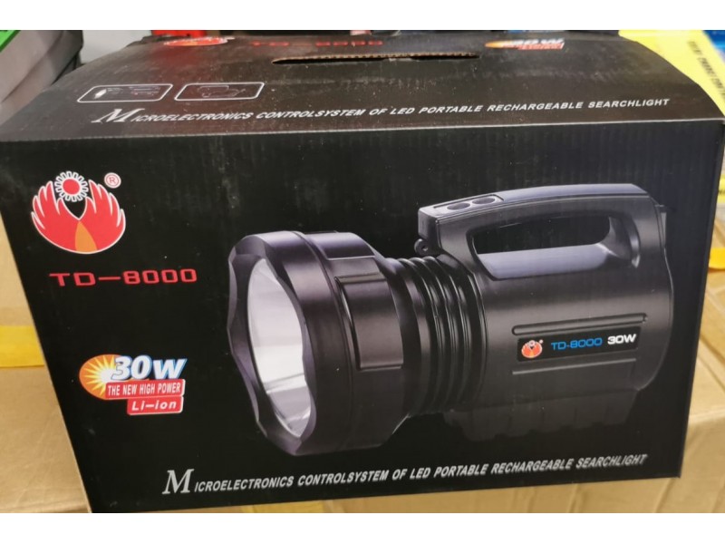 Lanterna led 30 W TD-8000 cu acumulator  ideala pentru paza, drumetii,camping,exploratori,operatiuni tactice. Are doua butoane etansate, situate pe maner: primul activeaza cele 3 moduri de iluminare, al doilea buton opreste lanterna si reseteaza tipul de iluminat la cel initial (la prima faza, cea economica). Sistem incarcare la priza normala (220V) direct in lanterna prin mufa de incarcare pozitionata pe partea opusa reflectorului Mufa de incarcare este protejata de umezeala si praf, printr-un capacel din cauciuc
