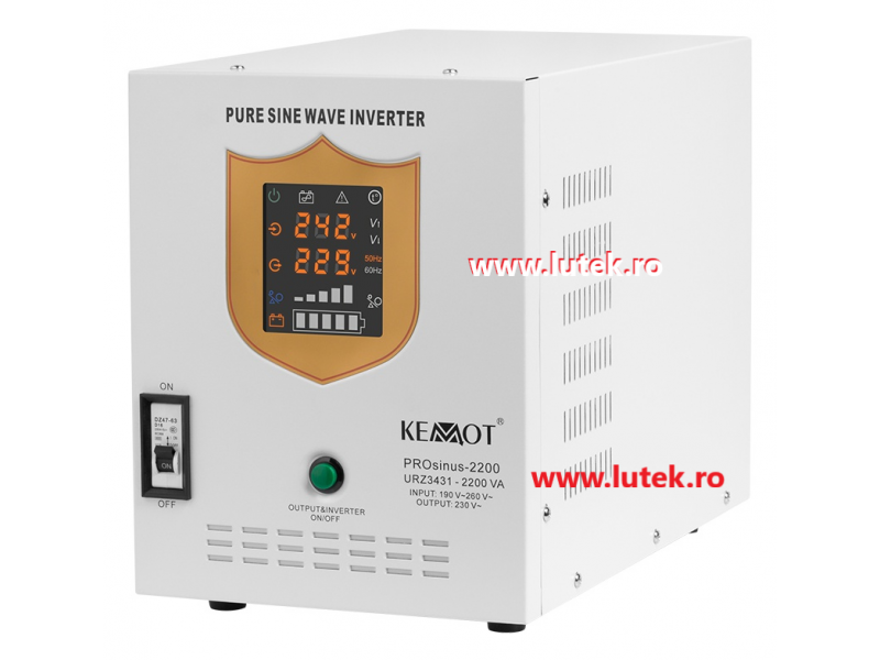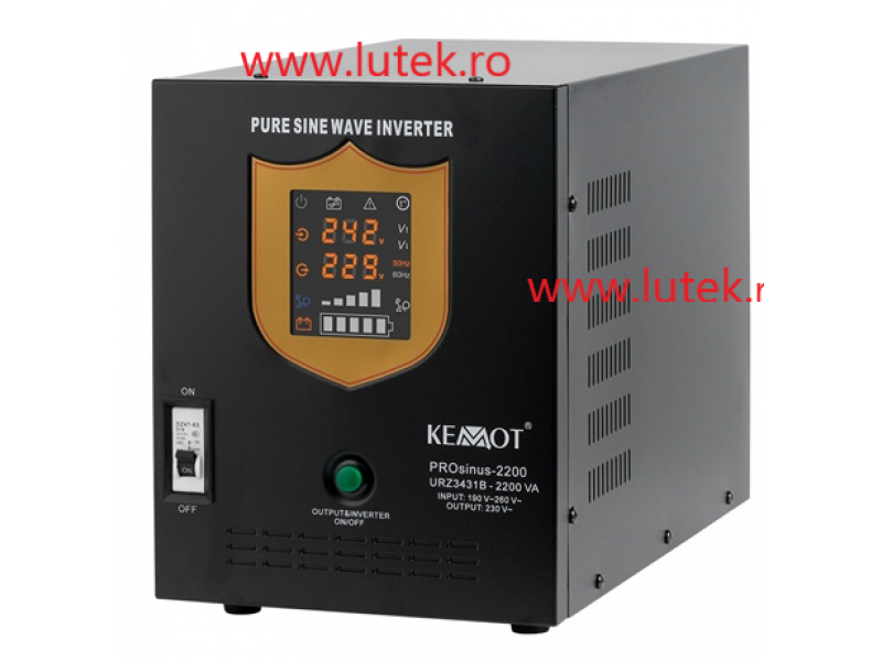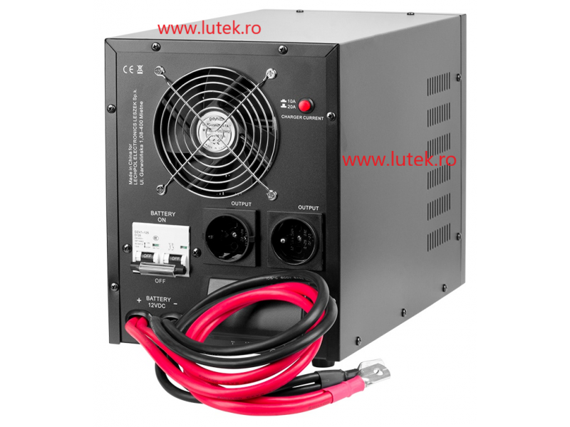 pentru acumulatorul extern. Specificatii: Putere nominală: 1550W, - 2200VA Tip acumulator : 12V DC,/ 60Ah-150Ah nu este inclus, recomandat tip gel, AGM,se pot fofosi si cei din gama auto Tensiune maximă baterie: 15V DC Gama tensiunii de intrare-alimentare retea, : 180 ~ 275V AC Frecventa tensiunii de intrare: 45 ~ 60Hz Gama tensiunii de ieșire: 230V AC +/- 8% , la 2 prize sutcho Frecvența de ieșire: 50 / 60Hz +/- 0.5Hz Forma tensiunii de ieșire: undă sinusoidală pură Randament: 85% (DC-AC) Încărcarea bateriei cu un curent max. de 10A,20A Timp de comutare: <= 4ms Protectii: suprasarcină, scurtcircuit, supraincalzire Temperatura de operare: 0-40 grade C Umiditate: 1- 90 %