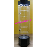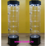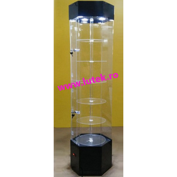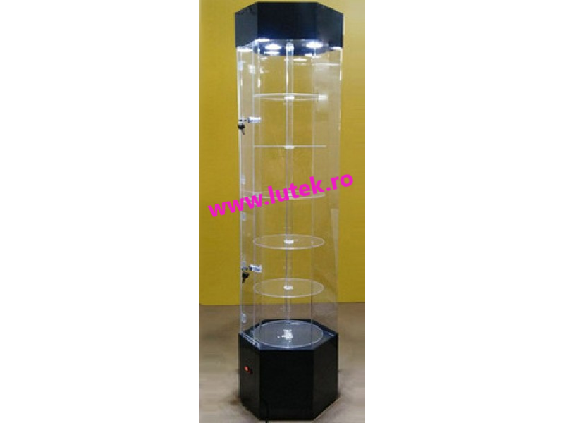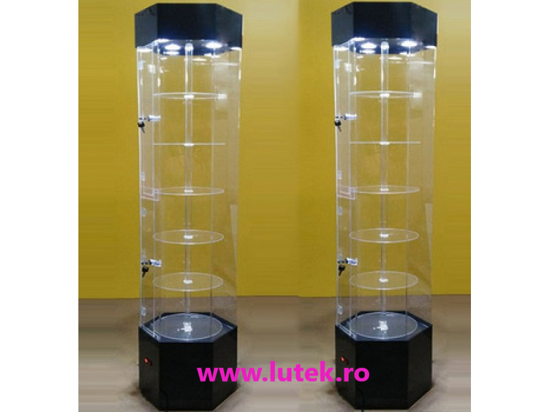 Vitrina 7 polite rotative pentru expunere ceasuri, bijuterii , obiecte mici, etc. Vitrina are 7 polite rotative din plexiglas, lumina interioara pe axul central si spoturi cu led in tavan pentru iluminare. Functiile de rotire si iluminare se actioneaza dupa preferinta cu ajutorul unor intrerupatoare.